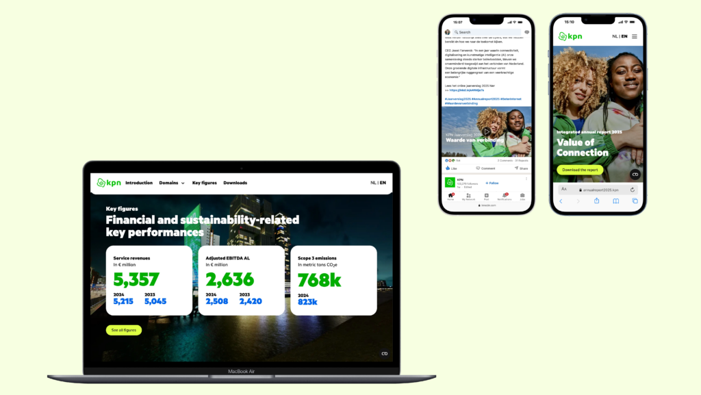 After being introduced to KPN following the go‑live of their previous annual report, TD Cascade was selected to redesign the KPN Annual Report 2025. The key challenge was to bring greater consistency, clarity and brand alignment across the reporting suite. In addition, new design elements needed to be implemented into the publication tooling and translated seamlessly into a fully responsive website that supported KPN’s digital‑first ambitions.