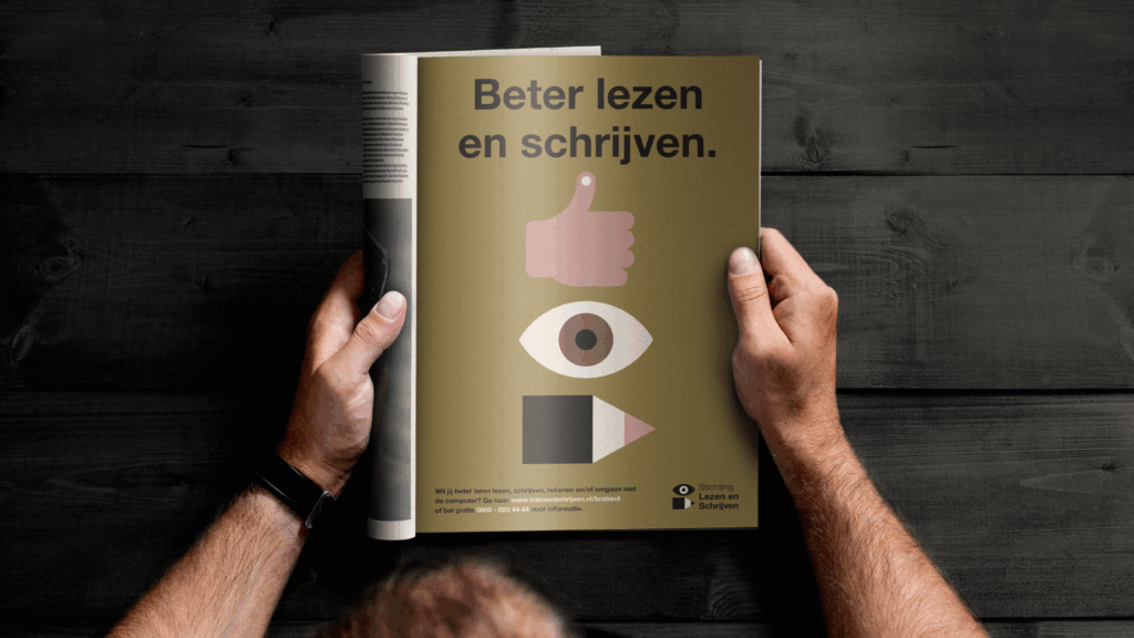 The new identity has helped Stichting Lezen en Schrijven express its mission more powerfully. Since its introduction, brand awareness has increased by 5% and theme awareness by 8% (2019–2022).