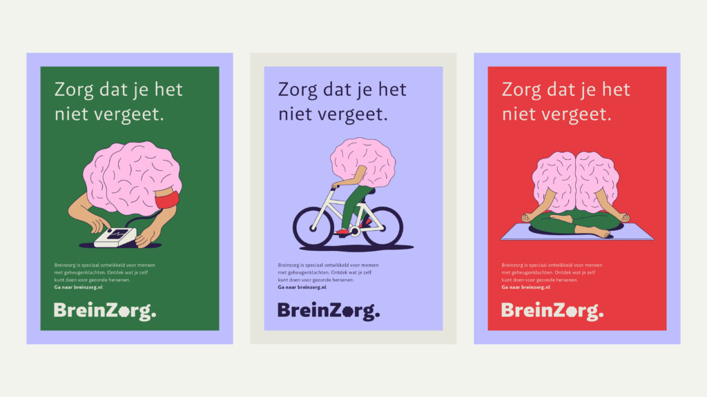 In this campaign, the positive note is in a sympathetic but clear copy, which also leaves room for individual interpretation. For example, we chose BreinZorg as the umbrella. A reference to the fact that the target group worries about the brain, but at the same time, the program helps them to take good care of it. As a tagline, we formulated Make sure you don’t forget. This makes it light-hearted and accessible. It makes it clear what the program can help you with. But at the same time, it is also an incentive to follow the modules.