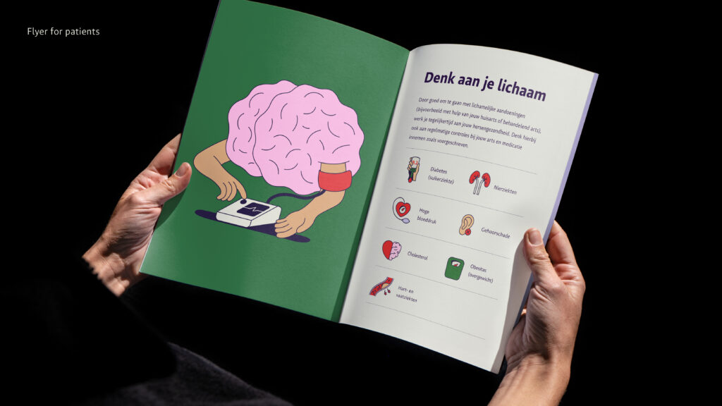 Because confronting memory problems is stressful enough, we took a positive, almost playful approach. With a cheerfully illustrated brain as a visual anchor, depicting the three themes, and a color palette not often encountered in a medical setting. This deliberate break from common “design codes” in the healthcare industry provides additional eye-catching value.