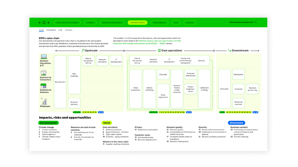We hebben één design systeem ontwikkeld voor zowel de online omgeving als de PDF‑publicatie, waardoor een coherente gebruikerservaring ontstond. Gebaseerd op KPN’s thema “Value of Connection” ontwikkelden we een visuele verhaallijn die is opgebouwd rond de vijf kerndomeinen van de organisatie, wat zorgde voor krachtiger storytelling en een meer intuïtieve gebruikersreis.
