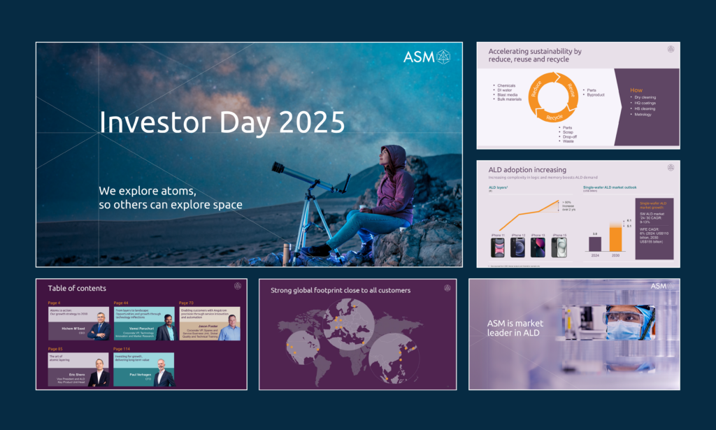 Na de succesvolle oplevering van het ASM Annual Report 2024 wilde ASM de kwaliteit aanscherpen voor de communicatiesuite rondom Investor Day 2025. Het doel: investeerders en analisten een helder, aantrekkelijk en toekomstgericht beeld geven van ASM’s prestaties en strategische prioriteiten richting 2030. De bijeenkomst op 23 september 2025 in het Pan Pacific London vroeg om een premium, consistent en herkenbaar ontworpen ervaring in alle communicatievormen.