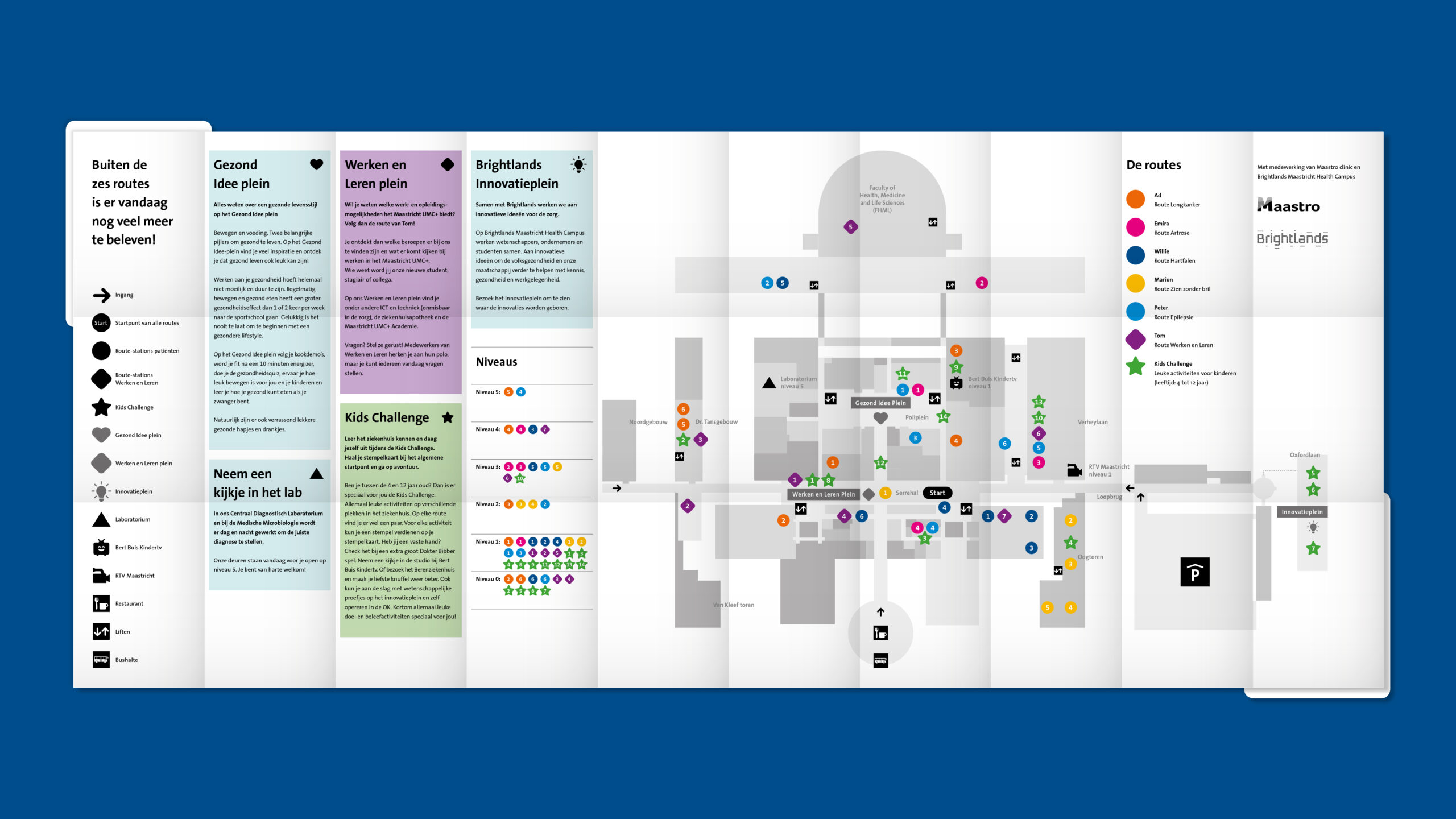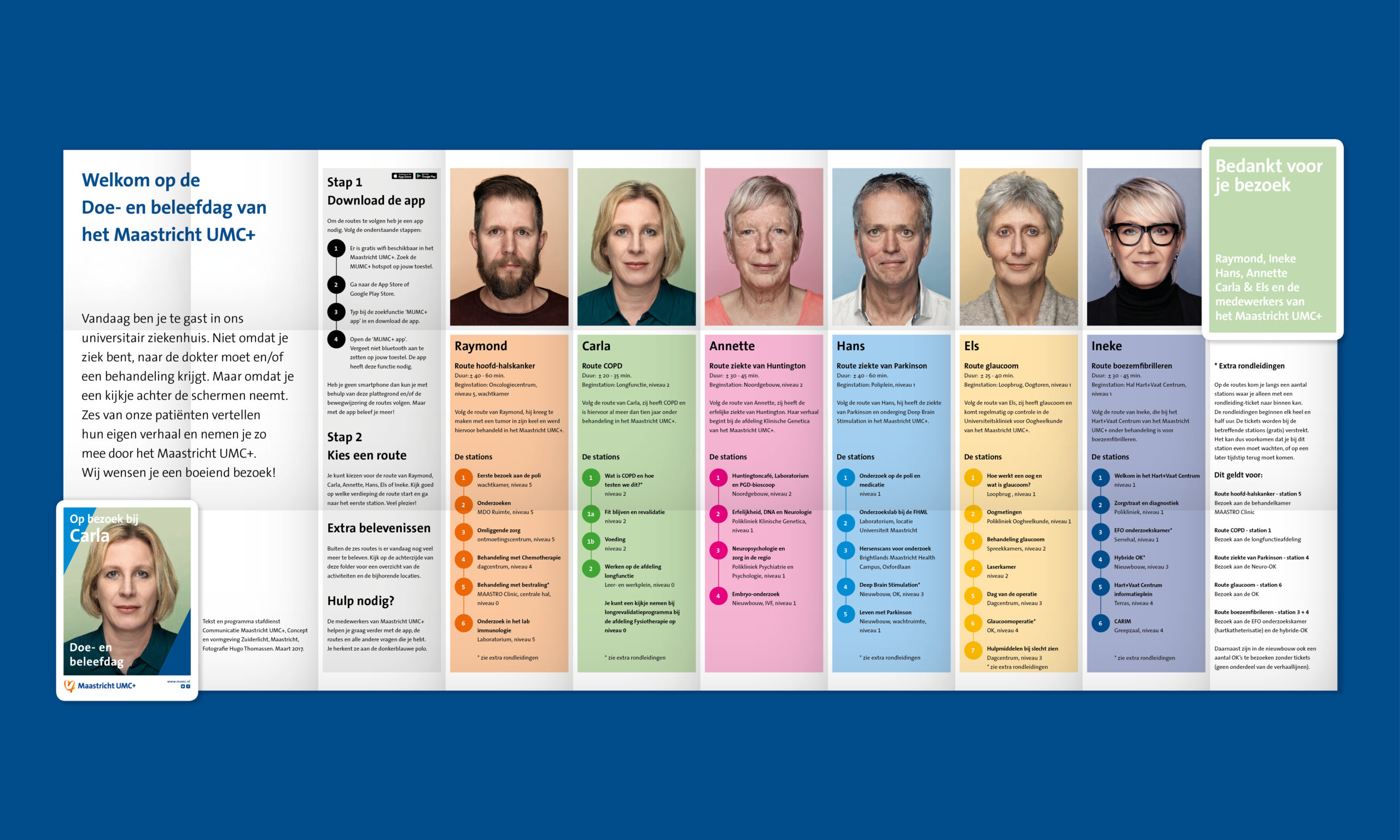 Zes waargebeurde medische verhalen van patiënten vormen de ruggengraat van de Doe- en Beleefdag. Bezoekers stappen als het ware in hun schoenen, van diagnose tot behandeling en nazorg. Via een speciaal ontwikkelde app, routemarkeringen op de vloeren en audiofragmenten volgen zij de route van een patiënt, langs plekken waar men normaal niet snel komt. Op elk tussenstation komen disciplines, technologie en medewerkers samen. Zo ontstaat een ervaring die persoonlijk, interactief en écht is. De verhalen geven een gezicht aan abstracte thema’s als wetenschap, preventie en innovatie, en maakten voelbaar wat Maastricht UMC+ uniek maakt: een universitair medisch centrum waar zorg, onderzoek en onderwijs elkaar raken in menselijkheid.